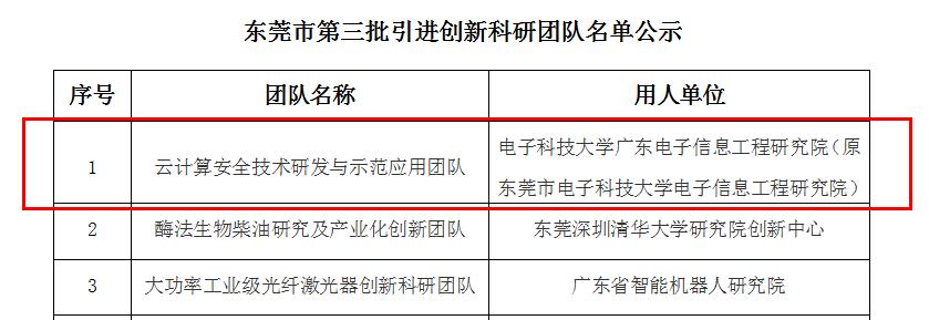 近日,东莞对拟引进的东莞市第三批创新科研团队有关情况进行公示(目前已公示完毕)。电子科技大学广东电子信息工程研究院(原东莞市电子科技大学电子信息工程研究院,简称“电研院”)“云计算安全技术研发与示范应用团队”获批东莞市第三批引进创新科研团队。