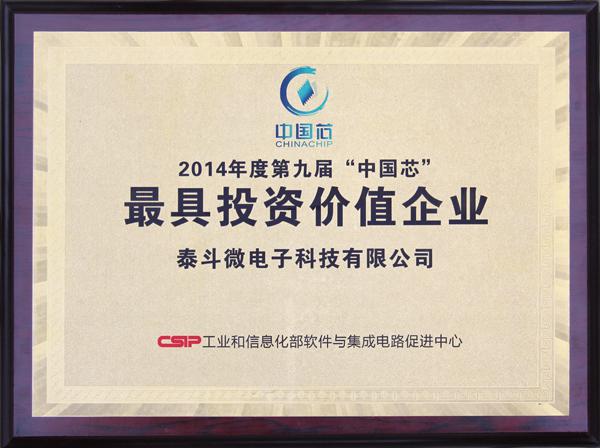 从2011年至2014年,泰斗微电子连续四年荣获“中国芯”奖项或参与相关项目,2011年荣获第六届“中国芯”之“最具潜质奖”,2012年在第七届“中国芯”大会上获得首家“中国芯”品牌使用授权,2013年和2014年连续两年摘取“中国芯”之“最具投资价值企业奖”。